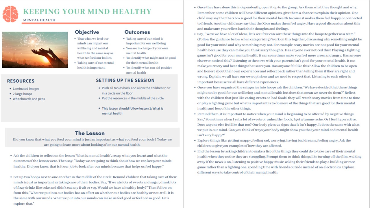 This lesson plan is designed for years 4/5 and 6 to help them think about what is 'healthy' for their minds. We explore the importance of looking after our minds just like we look after our bodies with a healthy diet. This lesson touches on technology/ gaming and late bedtimes and allows you to start a discussion with the children around their own wellbeing.